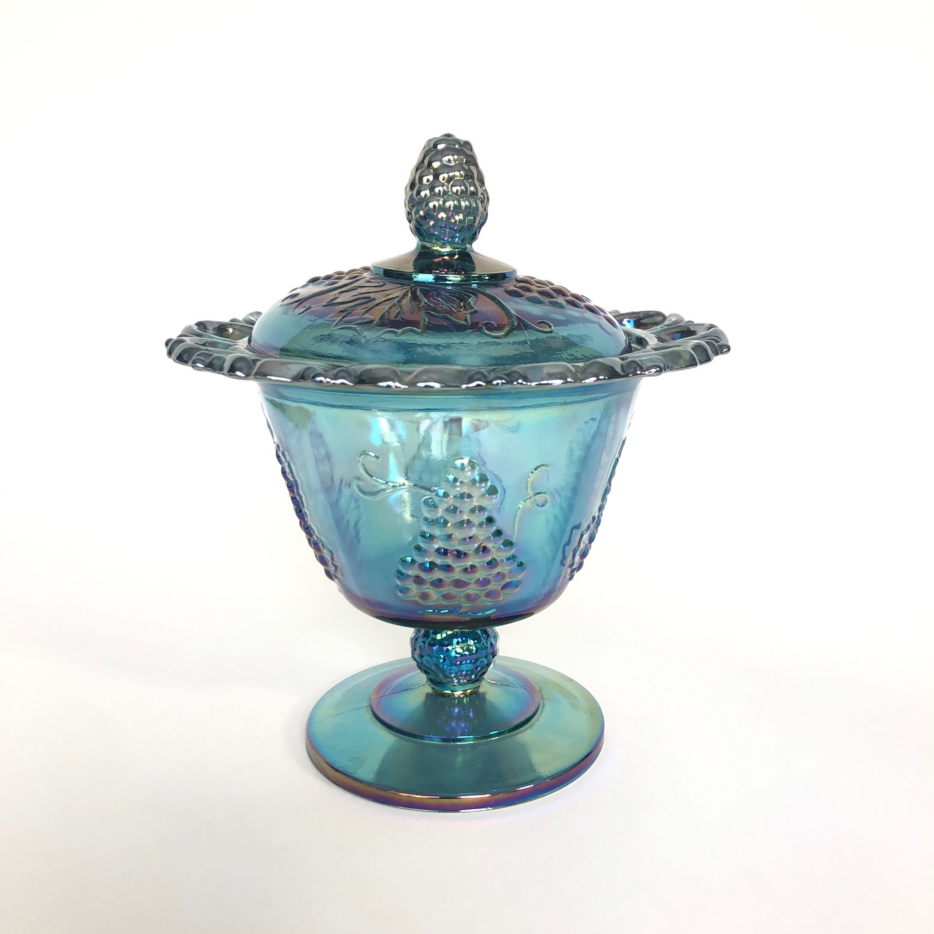 Vintage Blue Carnival Glass Covered Dish Bowl Compote Etsy Uk